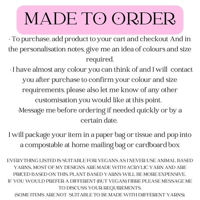 • Proudly Vegan since 2015, I only ever use plant based or synthetic yarn in my creations.